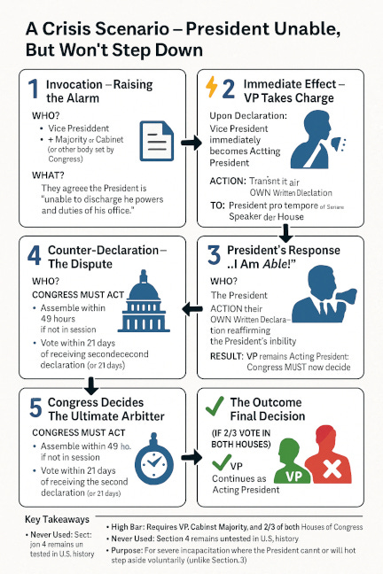 Section 4 of 25th amendment is a mess—letters, counter-letters, congressional action all on strict yet vague timetables. And the vice-president, majority of the cabinet plus two-thirds of Congress would need to agree on an ouster. Let us walk through it quickly.